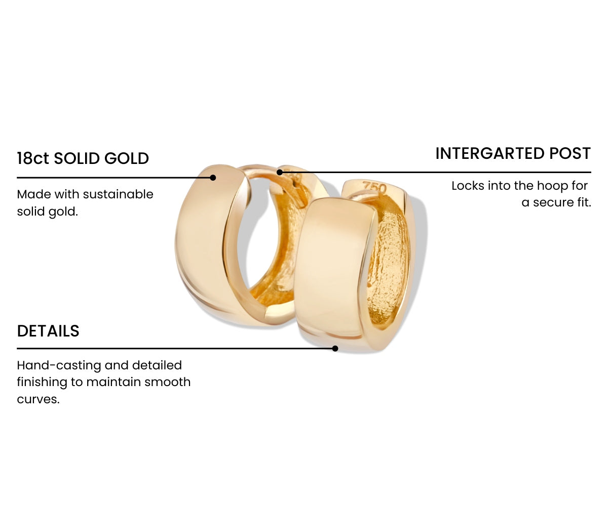 Looking for daily? We made heirlooms for your everyday. Rounded huggies in 18ct solid gold, shaped to stay close. Worn on the upper lobe, the helix, or in between, they hold with ease. Their gold hue stays warm, their form stays clear through every season. Waterproof, nickel free, and hypoallergenic - quiet luxury that is already yours.